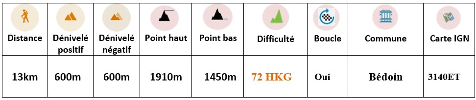 Cotation “Effort” FFRandonnée selon indice IBP : 0-25 : Facile ; 26-50 : Assez facile ; 51-75 : Peu difficile ; 76-100 : Assez difficile ; >100 : Difficile
